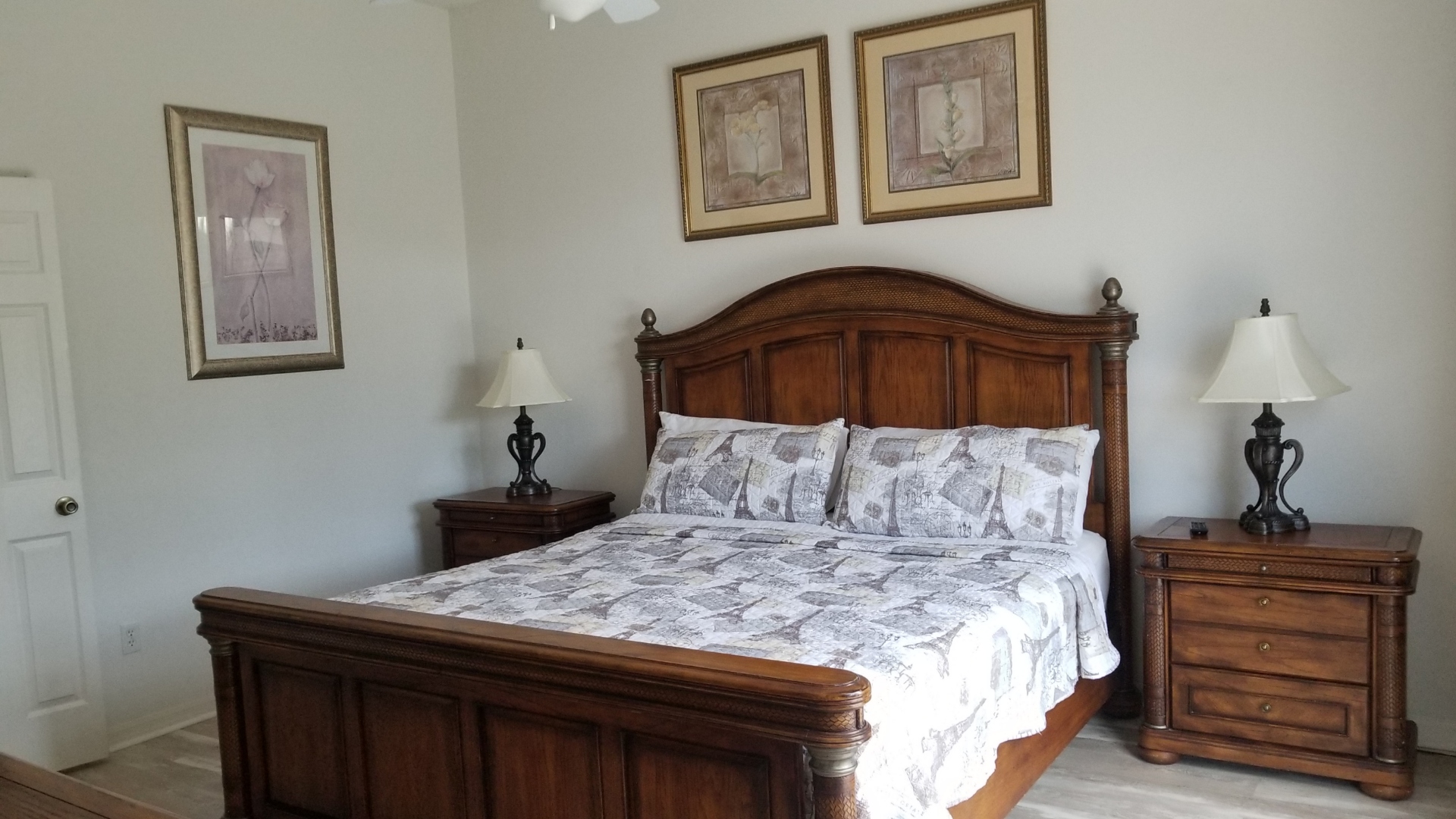 The Main Master Bedroom has a King Size (6 foot) Bed, with side tables with lamps and a large Dresser.